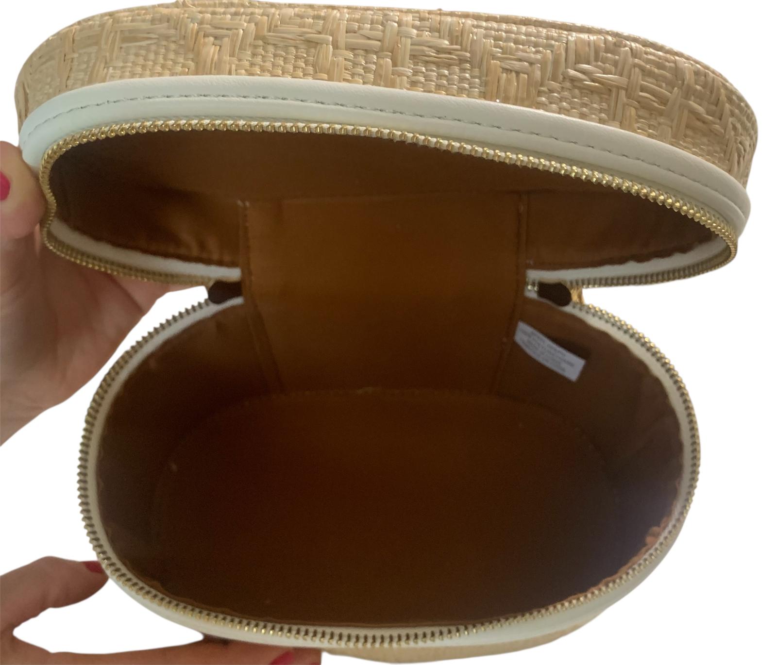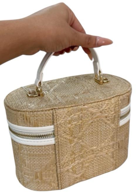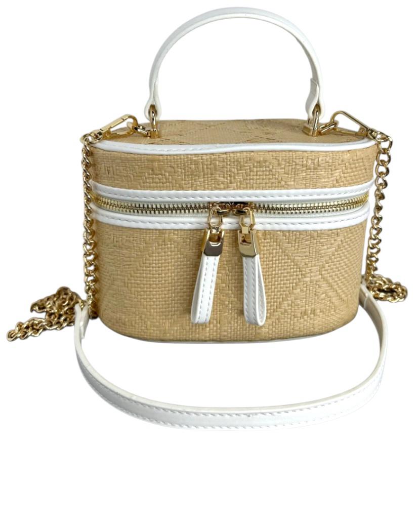 BAULETTO IN RAFIA CON CHIUSURA A CERNIERA E DETTAGLI IN PELLE DI COLORE BIANCO ED E' PRESENTE UNA TRACOLLA