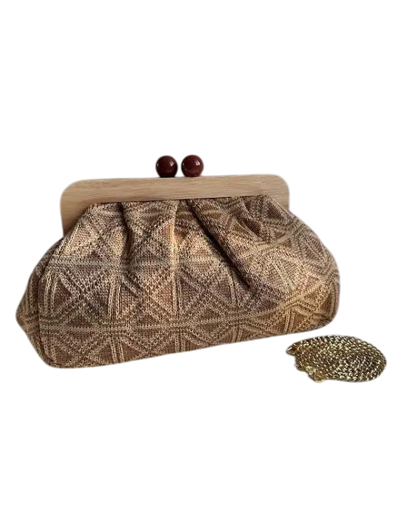 BORSA LAVORATA A MANO CON BORDATURA IN LEGNO E CHIUSURA MAGNETICA. DOTATA DI CATENINA TRACOLLA IN ORO.