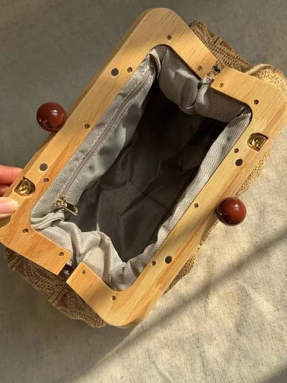 BORSA LAVORATA A MANO CON BORDATURA IN LEGNO E CHIUSURA MAGNETICA. DOTATA DI CATENINA TRACOLLA IN ORO.