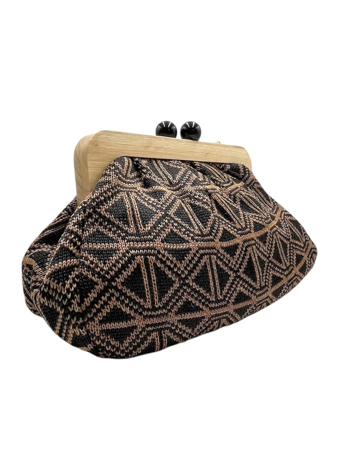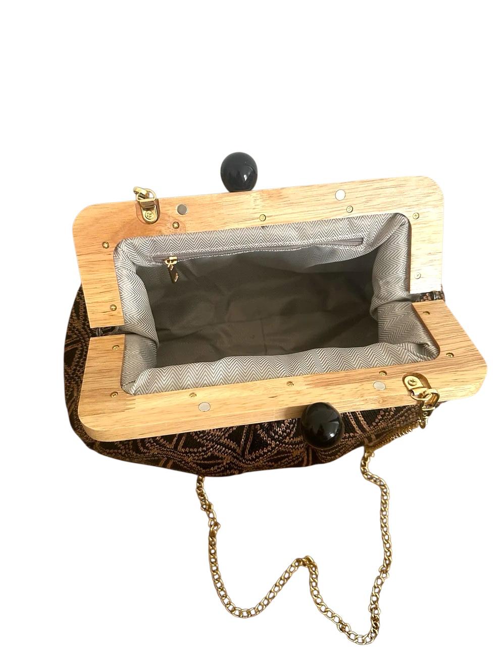 BORSA LAVORATA A MANO CN BORDATURA IN LEGNO E CHIUSURA MAGNETICA.DOTATA DI CATENINA TRACOLLA IN ORO.