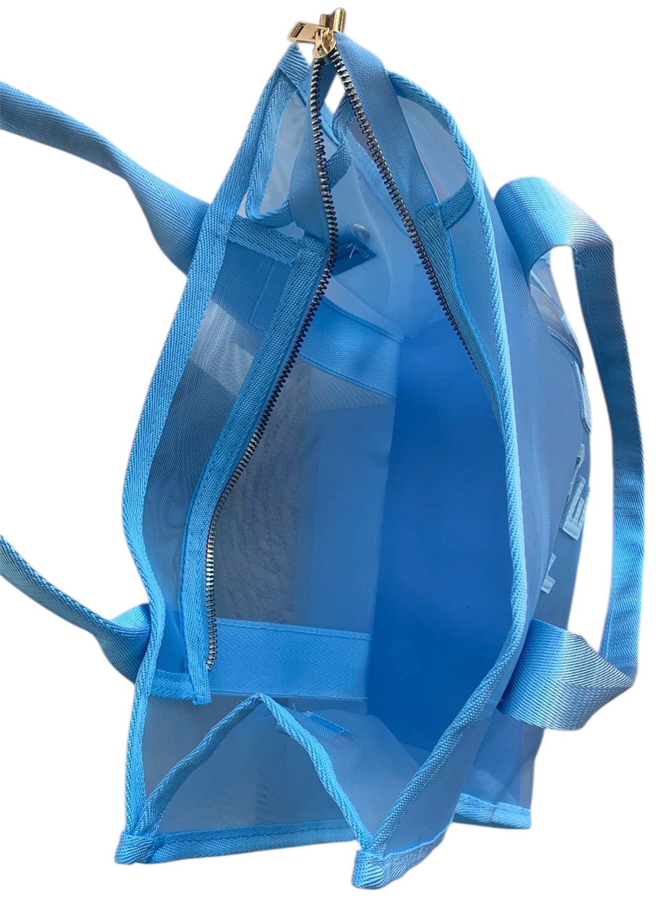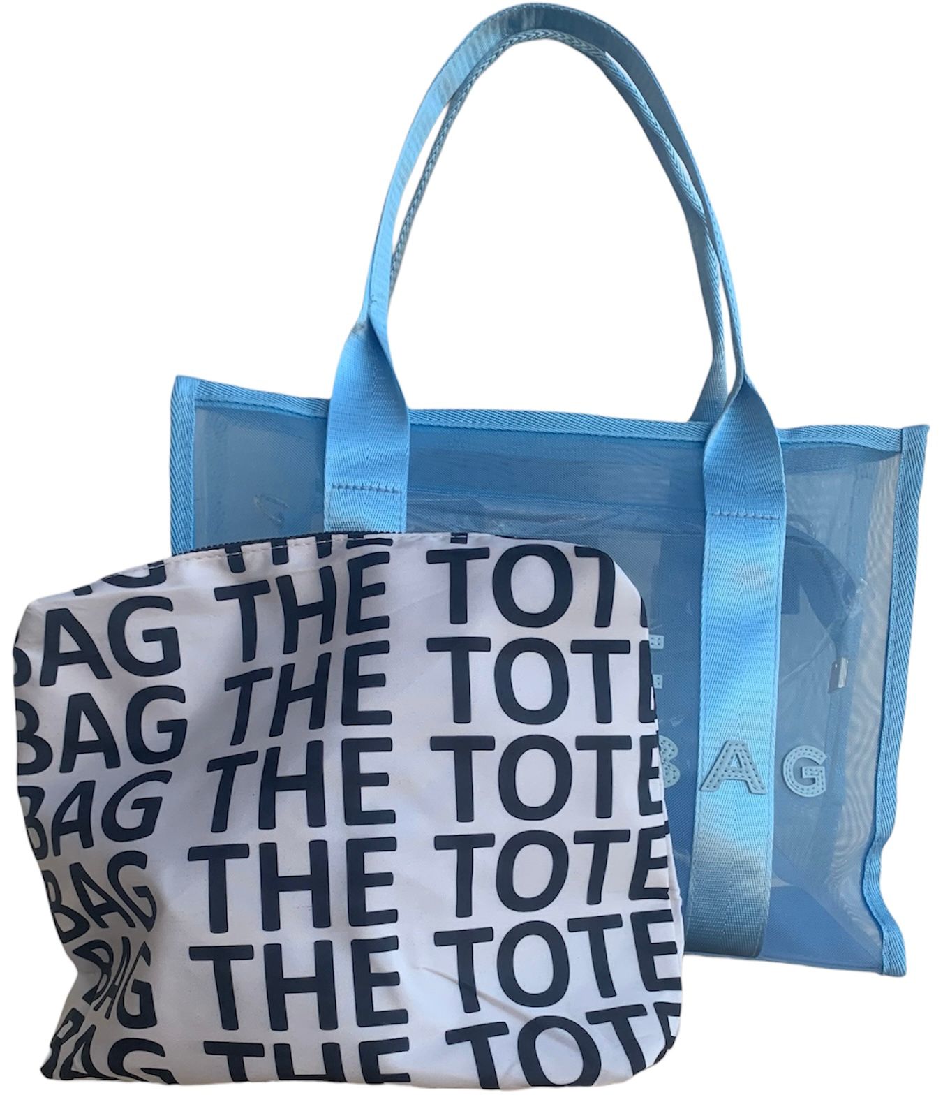 BORSA DI COLORE AZZURRO,DESIGN TRASPARENTE,CHIUSURA A CERNIERA,LOGO IN PELLE NELLA PARTE ANTERIORE,E' PRENTE UNA TRACOLLA E UNA POCHETTE DI COLORE BIANCO LOGATA IN NERO DI TESSUTO CON CHIUSURA A CERNIERA