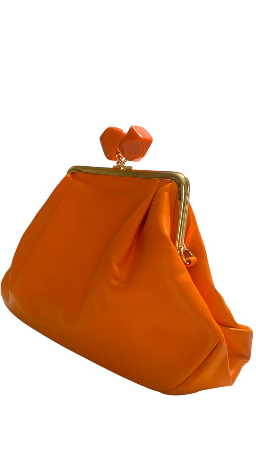 POCHETTE DI COLORE ARANCIO DOTATA DI TRACOLLA CATENA DI COLORE ORO,CHISURA A CLIP,E SONO PRESENTI DUE TASCHINE ALL'INTERNO DI CUI UNA CON CHIUSURA A CERNIERA
