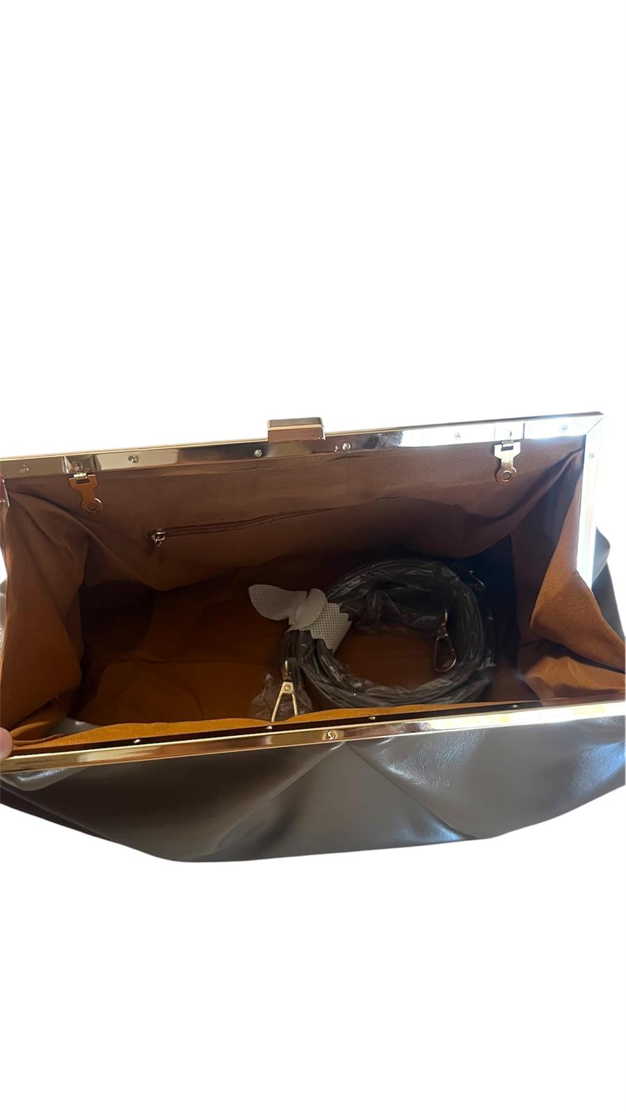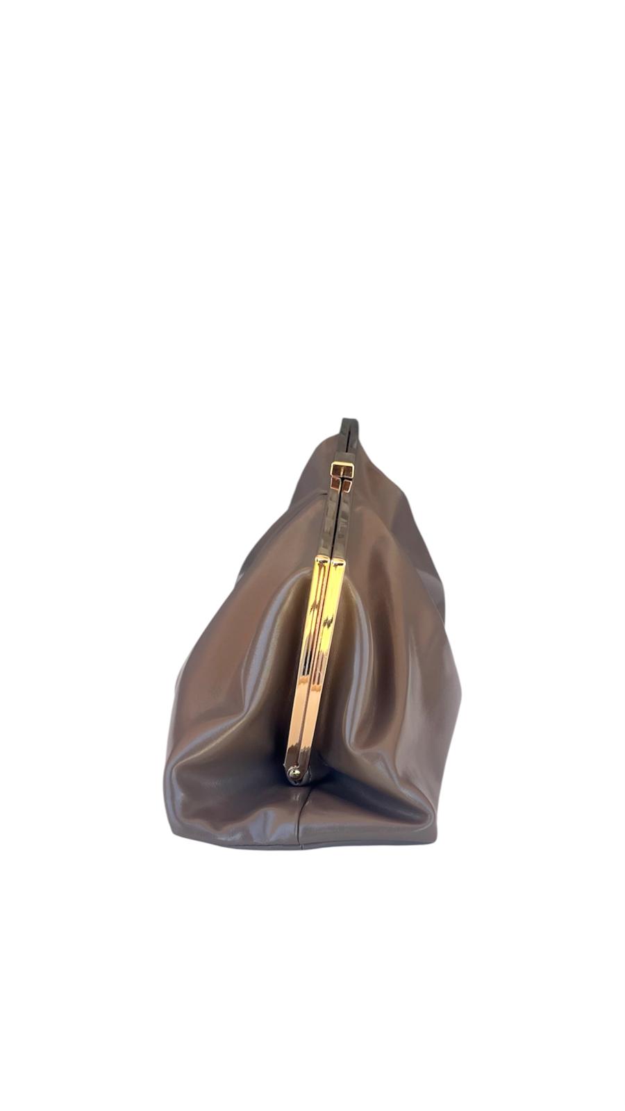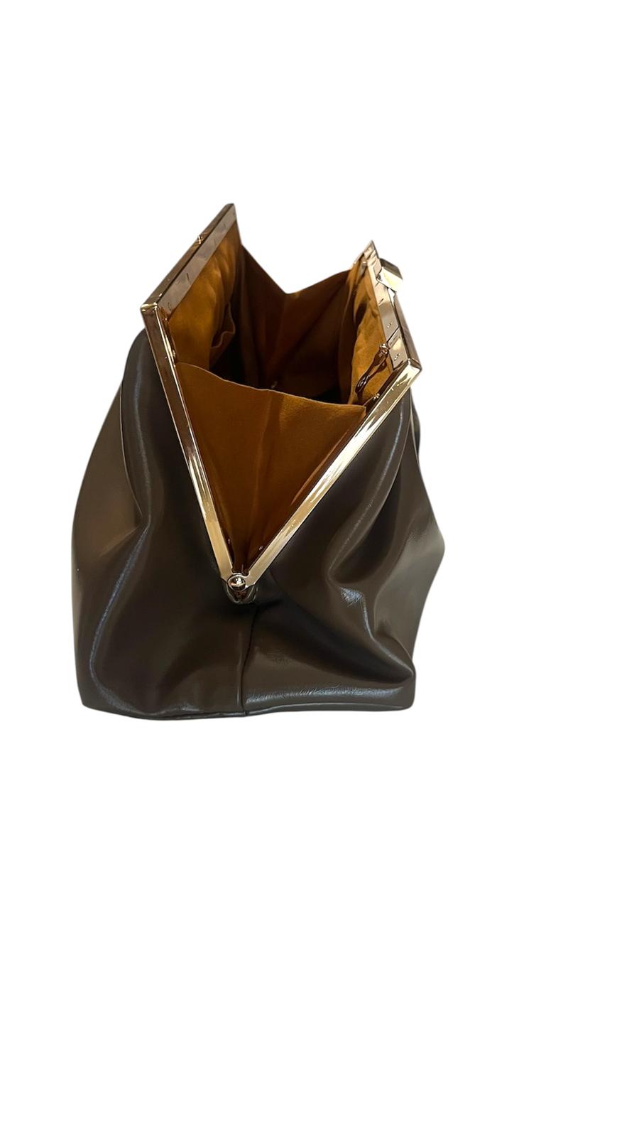 POCHETTE DI  COLORE CACHI (TERRA) DOTATA DI TRACOLLA IN PELLE CON GANCI ORO,CHIUSURA A CLIP,SONO PRESENTI 2 TASCHINE,DI CUI UNA CON CHIUSURA A CERNIERA